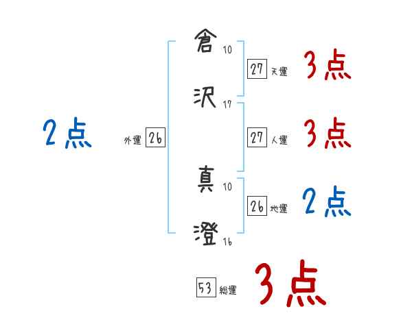 総運![]() | 倉沢真澄さんの総運は53画の3つ星!やや見栄っ張りで虚栄心がある。散財に注意。 あなたの人生を表す1番重要な運勢です。生涯を通じて影響する総合運となり、主に50歳以降の晩年期に影響を及ぼします。 |