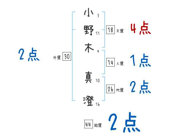 天運![]() | 小野木真澄さんの天運は18画の4つ星!情熱的で剛気。忍耐力があり信頼される。 家系が持つ宿命的な運勢を表します。祖先から受け継いだ苗字ですので自分の力が及びません。家柄を象徴します。 |