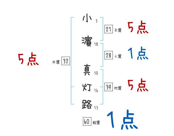 外運![]() | 小濵真灯路さんの外運は32画の5つ星!柔軟性があり成功する。チャンスが多く金運が良い。 生活面を象徴する運勢です。外部から受ける影響力を表し、結婚運、家庭運や職場、環境への順応性を表します。 |