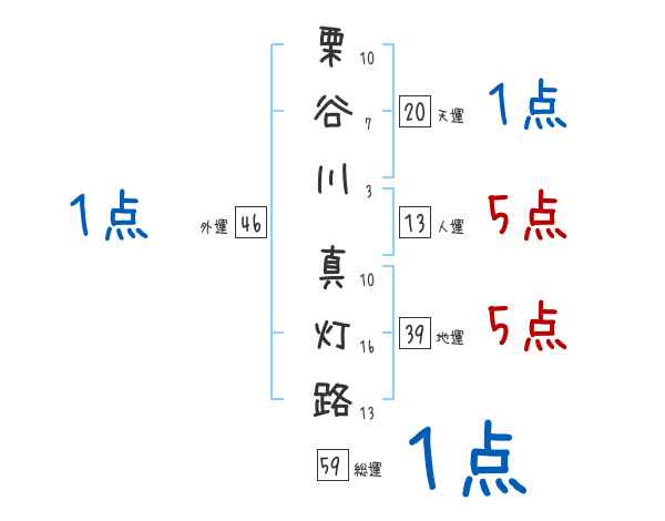 総運![]() | 栗谷川真灯路さんの総運は59画の1つ星!意志の弱さであきらめることが多いかも。粘り強さが必要。 あなたの人生を表す1番重要な運勢です。生涯を通じて影響する総合運となり、主に50歳以降の晩年期に影響を及ぼします。 |