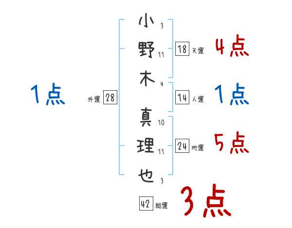 天運![]() | 小野木真理也さんの天運は18画の4つ星!情熱的で剛気。忍耐力があり信頼される。 家系が持つ宿命的な運勢を表します。祖先から受け継いだ苗字ですので自分の力が及びません。家柄を象徴します。 |