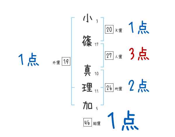 外運![]() | 小篠真理加さんの外運は19画の1つ星!優れた才能を持ちますが、協調性が足りないことも。周りの人と協力する事を意識しましょう。 生活面を象徴する運勢です。外部から受ける影響力を表し、結婚運、家庭運や職場、環境への順応性を表します。 |