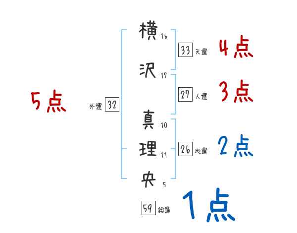 外運![]() | 横沢真理央さんの外運は32画の5つ星!柔軟性があり成功する。チャンスが多く金運が良い。 生活面を象徴する運勢です。外部から受ける影響力を表し、結婚運、家庭運や職場、環境への順応性を表します。 |