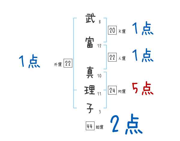 外運![]() | 武富真理子さんの外運は22画の1つ星!努力することが苦手ないっぽう手先が器用。芸術性にも優れる。 生活面を象徴する運勢です。外部から受ける影響力を表し、結婚運、家庭運や職場、環境への順応性を表します。 |