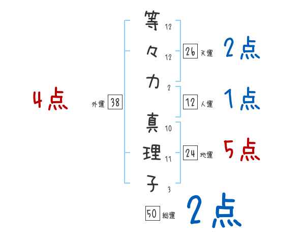 総運![]() | 等々力真理子さんの総運は50画の2つ星!浮き沈みが激しく不安定。しりすぼみに衰退しやすいので注意しましょう。 あなたの人生を表す1番重要な運勢です。生涯を通じて影響する総合運となり、主に50歳以降の晩年期に影響を及ぼします。 |