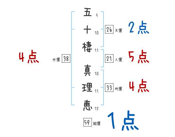 天運![]() | 五十棲真理恵さんの天運は26画の2つ星!波瀾万丈かも。信頼できる人を大事にしましょう。 家系が持つ宿命的な運勢を表します。祖先から受け継いだ苗字ですので自分の力が及びません。家柄を象徴します。 |