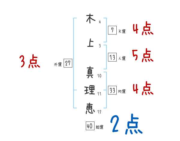 外運![]() | 木上真理恵さんの外運は27画の3つ星!頭脳明晰だが強情で摩擦が多い傾向。孤立に注意。 生活面を象徴する運勢です。外部から受ける影響力を表し、結婚運、家庭運や職場、環境への順応性を表します。 |