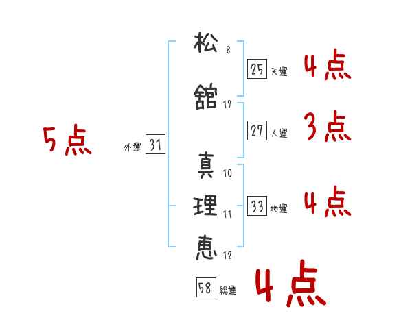 総運![]() | 松舘真理恵さんの総運は58画の4つ星!安定した生活。大器晩成タイプ。 あなたの人生を表す1番重要な運勢です。生涯を通じて影響する総合運となり、主に50歳以降の晩年期に影響を及ぼします。 |