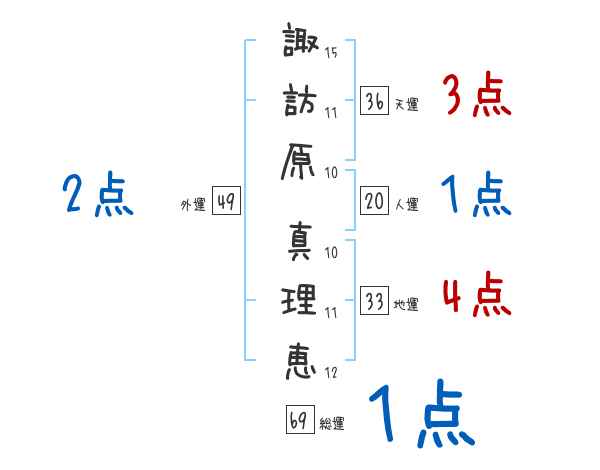 天運![]() | 諏訪原真理恵さんの天運は36画の3つ星!先見性が豊かです。多少神経質で苦労することも。 家系が持つ宿命的な運勢を表します。祖先から受け継いだ苗字ですので自分の力が及びません。家柄を象徴します。 |