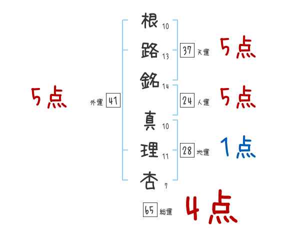 総運![]() | 根路銘真理杏さんの総運は65画の4つ星!幸運に恵まれ繁栄する。包容力がある。 あなたの人生を表す1番重要な運勢です。生涯を通じて影響する総合運となり、主に50歳以降の晩年期に影響を及ぼします。 |