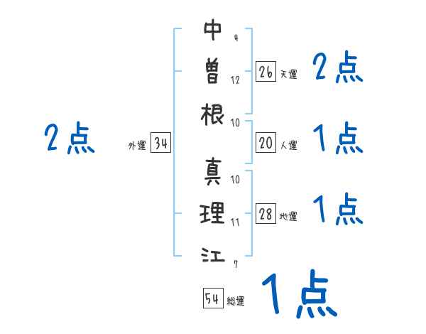 外運![]() | 中曽根真理江さんの外運は34画の2つ星!独創性に優れるが、自尊心が強く災難に注意しましょう。 生活面を象徴する運勢です。外部から受ける影響力を表し、結婚運、家庭運や職場、環境への順応性を表します。 |
