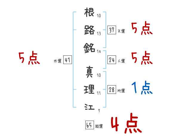 総運![]() | 根路銘真理江さんの総運は65画の4つ星!幸運に恵まれ繁栄する。包容力がある。 あなたの人生を表す1番重要な運勢です。生涯を通じて影響する総合運となり、主に50歳以降の晩年期に影響を及ぼします。 |