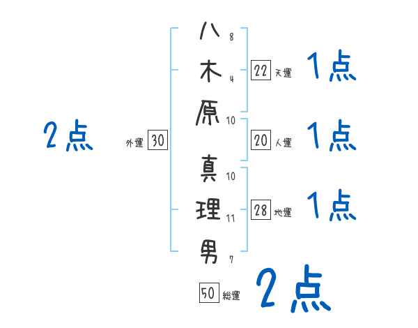 天運![]() | 八木原真理男さんの天運は22画の1つ星!努力することが苦手ないっぽう手先が器用。芸術性にも優れる。 家系が持つ宿命的な運勢を表します。祖先から受け継いだ苗字ですので自分の力が及びません。家柄を象徴します。 |