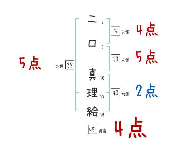 天運![]() | 二口真理絵さんの天運は5画の4つ星!健康で安泰。協調性に優れ、財産に恵まれる。 家系が持つ宿命的な運勢を表します。祖先から受け継いだ苗字ですので自分の力が及びません。家柄を象徴します。 |