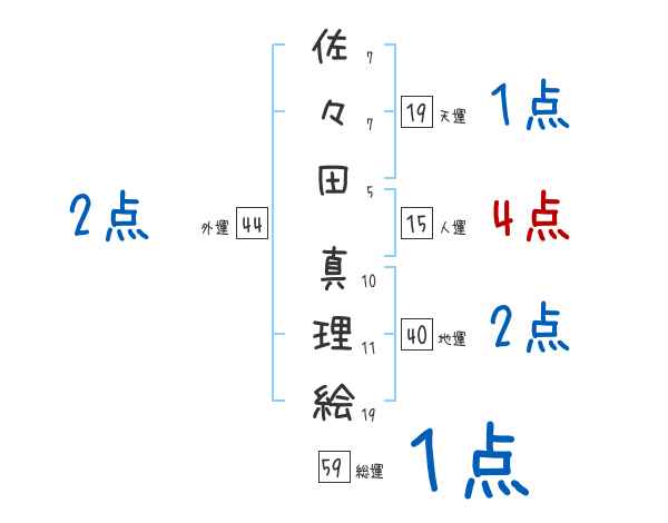 外運![]() | 佐々田真理絵さんの外運は44画の2つ星!誠実で慎重な性格。物事を考えすぎないように注意しましょう。 生活面を象徴する運勢です。外部から受ける影響力を表し、結婚運、家庭運や職場、環境への順応性を表します。 |
