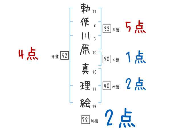 天運![]() | 勅使川原真理絵さんの天運は32画の5つ星!柔軟性があり成功する。チャンスが多く金運が良い。 家系が持つ宿命的な運勢を表します。祖先から受け継いだ苗字ですので自分の力が及びません。家柄を象徴します。 |