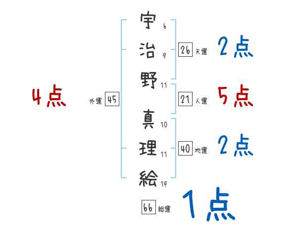 天運![]() | 宇治野真理絵さんの天運は26画の2つ星!波瀾万丈かも。信頼できる人を大事にしましょう。 家系が持つ宿命的な運勢を表します。祖先から受け継いだ苗字ですので自分の力が及びません。家柄を象徴します。 |
