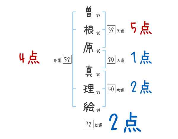 外運![]() | 曽根原真理絵さんの外運は52画の4つ星!先見性と独創性に優れ考える力がある。強運の持ち主。 生活面を象徴する運勢です。外部から受ける影響力を表し、結婚運、家庭運や職場、環境への順応性を表します。 |