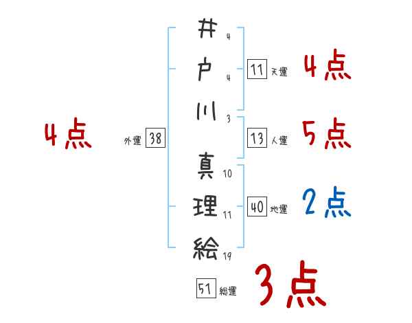 外運![]() | 井戸川真理絵さんの外運は38画の4つ星!温厚な性格で技術的な才能を発揮する。職人的な仕事に向いている。 生活面を象徴する運勢です。外部から受ける影響力を表し、結婚運、家庭運や職場、環境への順応性を表します。 |