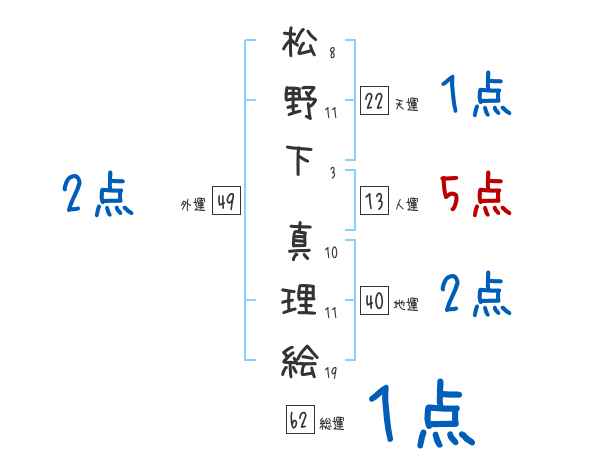天運![]() | 松野下真理絵さんの天運は22画の1つ星!努力することが苦手ないっぽう手先が器用。芸術性にも優れる。 家系が持つ宿命的な運勢を表します。祖先から受け継いだ苗字ですので自分の力が及びません。家柄を象徴します。 |