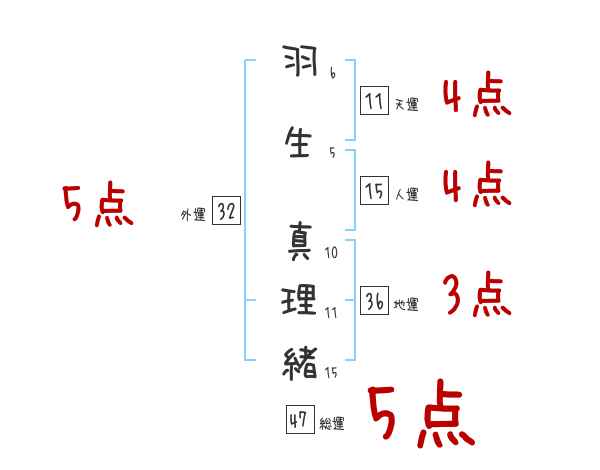 総運![]() | 羽生真理緒さんの総運は47画の5つ星!実力が開花し発展する円満な人生。財に恵まれる。 あなたの人生を表す1番重要な運勢です。生涯を通じて影響する総合運となり、主に50歳以降の晩年期に影響を及ぼします。 |