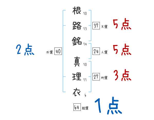 人運![]() | 根路銘真理衣さんの人運は24画の5つ星!家庭運が良く順調な人生。金運にも恵まれる。 性格や才能などを表す2番目に重要な運勢です。人間関係や協調性、社会的な成功に影響します。主に20歳から50歳ぐらいまでの中年期の運勢を表します。 |