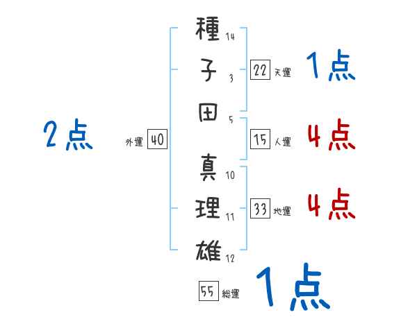 天運![]() | 種子田真理雄さんの天運は22画の1つ星!努力することが苦手ないっぽう手先が器用。芸術性にも優れる。 家系が持つ宿命的な運勢を表します。祖先から受け継いだ苗字ですので自分の力が及びません。家柄を象徴します。 |