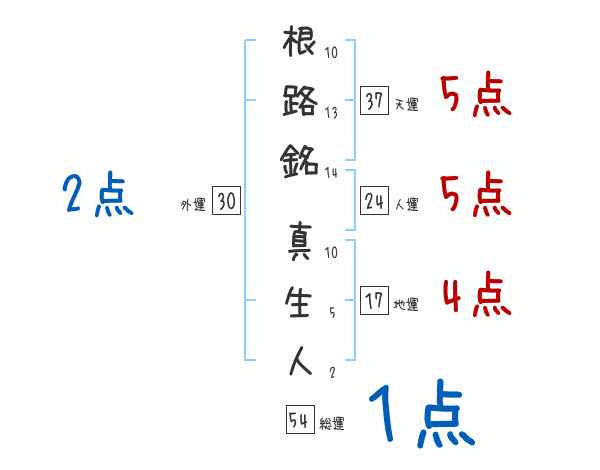 総運![]() | 根路銘真生人さんの総運は54画の1つ星!トラブルが多いかも。周りをよく見て協調して過ごしましょう。 あなたの人生を表す1番重要な運勢です。生涯を通じて影響する総合運となり、主に50歳以降の晩年期に影響を及ぼします。 |