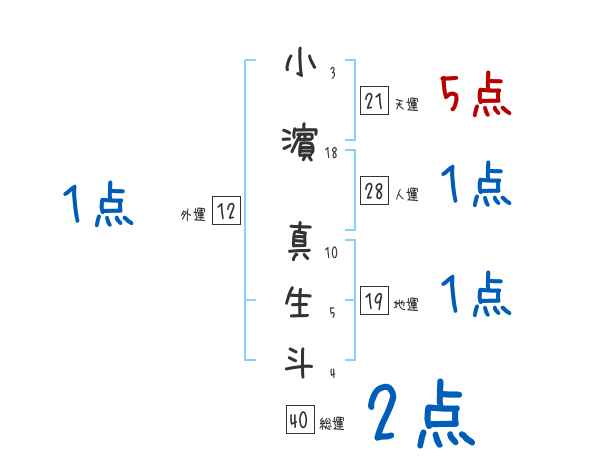 天運![]() | 小濵真生斗さんの天運は21画の5つ星!統率力がある。独立し成功する。名誉を手に入れる。 家系が持つ宿命的な運勢を表します。祖先から受け継いだ苗字ですので自分の力が及びません。家柄を象徴します。 |
