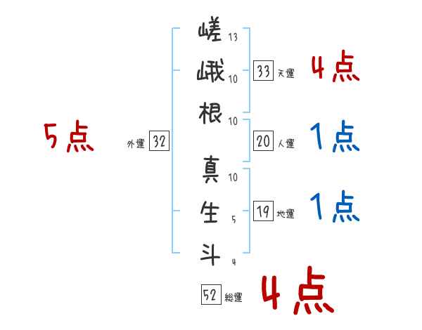 外運![]() | 嵯峨根真生斗さんの外運は32画の5つ星!柔軟性があり成功する。チャンスが多く金運が良い。 生活面を象徴する運勢です。外部から受ける影響力を表し、結婚運、家庭運や職場、環境への順応性を表します。 |