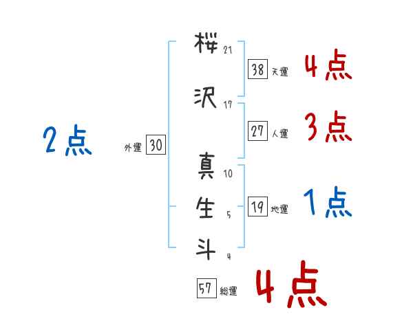 総運![]() | 桜沢真生斗さんの総運は57画の4つ星!向上心があり人望がある。地位を得る。 あなたの人生を表す1番重要な運勢です。生涯を通じて影響する総合運となり、主に50歳以降の晩年期に影響を及ぼします。 |