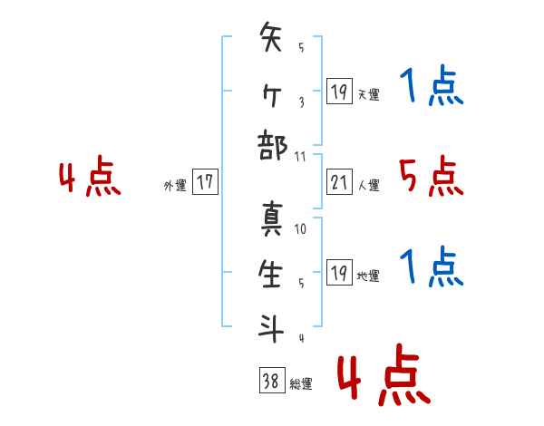 外運![]() | 矢ヶ部真生斗さんの外運は17画の4つ星!積極的な行動力。地位を気づき財産を手に入れる。純粋な心と直感力。 生活面を象徴する運勢です。外部から受ける影響力を表し、結婚運、家庭運や職場、環境への順応性を表します。 |