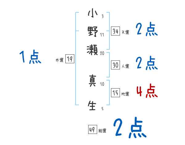小野瀬真生さんの画数の鑑定結果