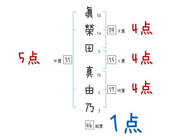 天運![]() | 眞榮田真由乃さんの天運は29画の4つ星!完全主義で才能がある。厳格な心の持ち主。 家系が持つ宿命的な運勢を表します。祖先から受け継いだ苗字ですので自分の力が及びません。家柄を象徴します。 |