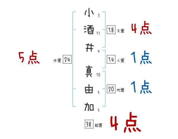 外運![]() | 小酒井真由加さんの外運は24画の5つ星!家庭運が良く順調な人生。金運にも恵まれる。 生活面を象徴する運勢です。外部から受ける影響力を表し、結婚運、家庭運や職場、環境への順応性を表します。 |