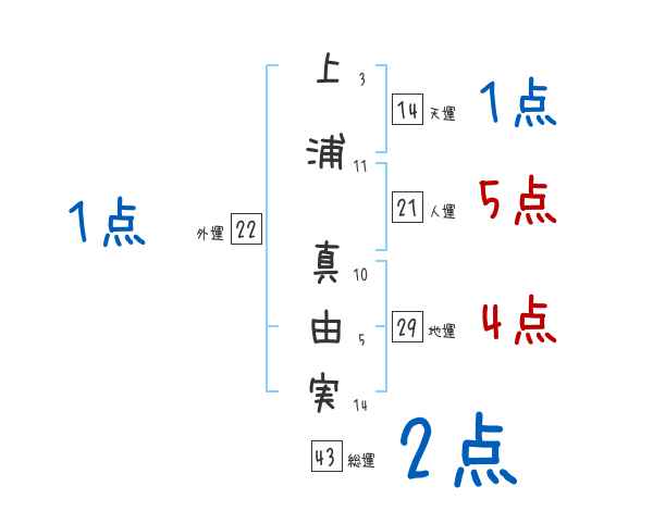総運![]() | 上浦真由実さんの総運は43画の2つ星!頑固な性格で独立心が強いかも。やや非現実的で浪費に注意しましょう。 あなたの人生を表す1番重要な運勢です。生涯を通じて影響する総合運となり、主に50歳以降の晩年期に影響を及ぼします。 |