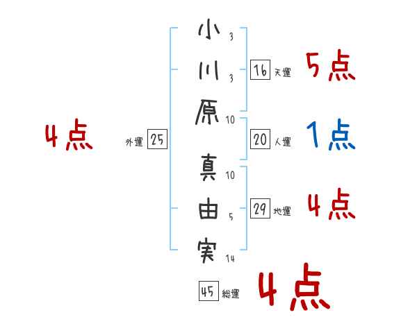 天運![]() | 小川原真由実さんの天運は16画の5つ星!人望が厚く大きく発展する。逆転成功が見える。 家系が持つ宿命的な運勢を表します。祖先から受け継いだ苗字ですので自分の力が及びません。家柄を象徴します。 |