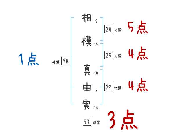 外運![]() | 相模真由実さんの外運は28画の1つ星!家庭環境に注意。スポーツで活躍できる能力があるかも。 生活面を象徴する運勢です。外部から受ける影響力を表し、結婚運、家庭運や職場、環境への順応性を表します。 |