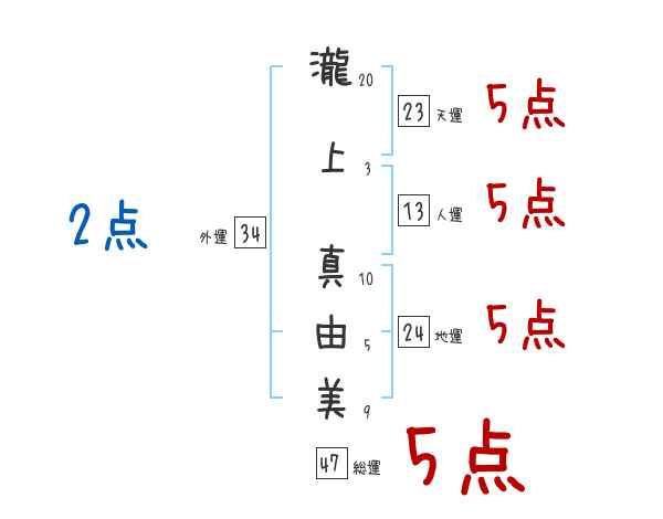 総運![]() | 瀧上真由美さんの総運は47画の5つ星!実力が開花し発展する円満な人生。財に恵まれる。 あなたの人生を表す1番重要な運勢です。生涯を通じて影響する総合運となり、主に50歳以降の晩年期に影響を及ぼします。 |