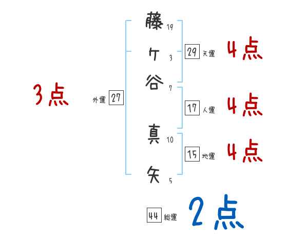 天運![]() | 藤ヶ谷真矢さんの天運は29画の4つ星!完全主義で才能がある。厳格な心の持ち主。 家系が持つ宿命的な運勢を表します。祖先から受け継いだ苗字ですので自分の力が及びません。家柄を象徴します。 |