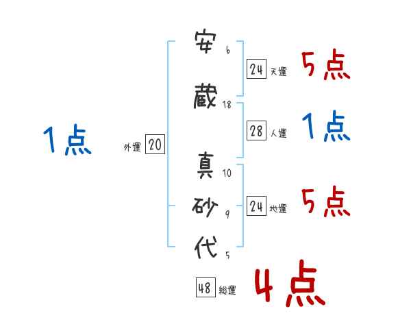 天運![]() | 安蔵真砂代さんの天運は24画の5つ星!家庭運が良く順調な人生。金運にも恵まれる。 家系が持つ宿命的な運勢を表します。祖先から受け継いだ苗字ですので自分の力が及びません。家柄を象徴します。 |