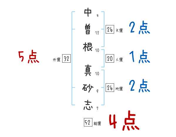 外運![]()  | 中曽根真砂志さんの外運は32画の5つ星!柔軟性があり成功する。チャンスが多く金運が良い。 生活面を象徴する運勢です。外部から受ける影響力を表し、結婚運、家庭運や職場、環境への順応性を表します。 |