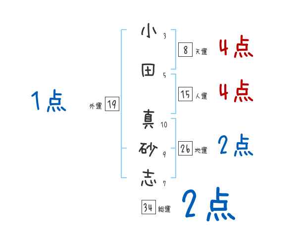 外運![]() | 小田真砂志さんの外運は19画の1つ星!優れた才能を持ちますが、協調性が足りないことも。周りの人と協力する事を意識しましょう。 生活面を象徴する運勢です。外部から受ける影響力を表し、結婚運、家庭運や職場、環境への順応性を表します。 |