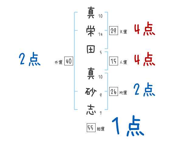 天運![]() | 真栄田真砂志さんの天運は29画の4つ星!完全主義で才能がある。厳格な心の持ち主。 家系が持つ宿命的な運勢を表します。祖先から受け継いだ苗字ですので自分の力が及びません。家柄を象徴します。 |