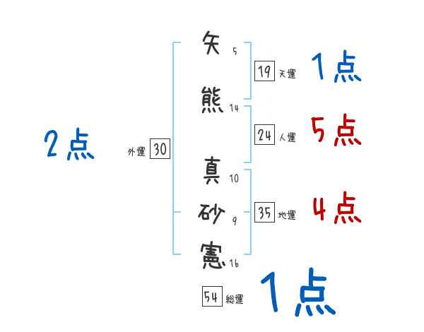 人運![]() | 矢熊真砂憲さんの人運は24画の5つ星!家庭運が良く順調な人生。金運にも恵まれる。 性格や才能などを表す2番目に重要な運勢です。人間関係や協調性、社会的な成功に影響します。主に20歳から50歳ぐらいまでの中年期の運勢を表します。 |