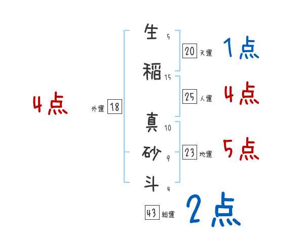 外運![]() | 生稲真砂斗さんの外運は18画の4つ星!情熱的で剛気。忍耐力があり信頼される。 生活面を象徴する運勢です。外部から受ける影響力を表し、結婚運、家庭運や職場、環境への順応性を表します。 |