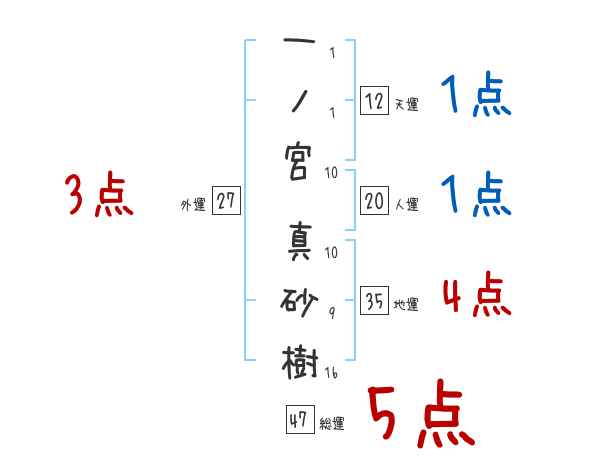 総運![]() | 一ノ宮真砂樹さんの総運は47画の5つ星!実力が開花し発展する円満な人生。財に恵まれる。 あなたの人生を表す1番重要な運勢です。生涯を通じて影響する総合運となり、主に50歳以降の晩年期に影響を及ぼします。 |