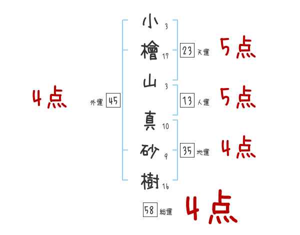 天運![]() | 小檜山真砂樹さんの天運は23画の5つ星!想像力に優れ活力がある。一代で成功し名誉を手に入れる。 家系が持つ宿命的な運勢を表します。祖先から受け継いだ苗字ですので自分の力が及びません。家柄を象徴します。 |