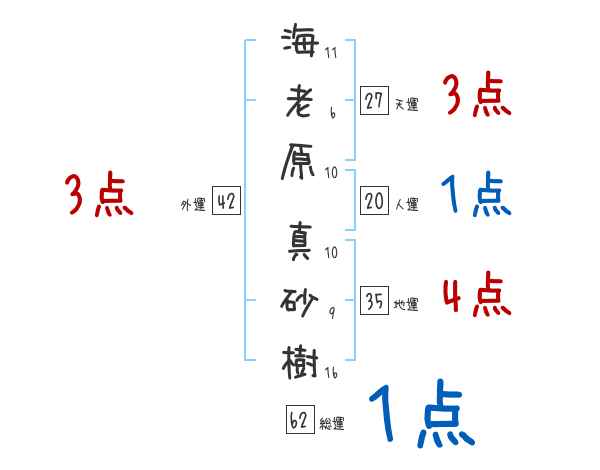 天運![]() | 海老原真砂樹さんの天運は27画の3つ星!頭脳明晰だが強情で摩擦が多い傾向。孤立に注意。 家系が持つ宿命的な運勢を表します。祖先から受け継いだ苗字ですので自分の力が及びません。家柄を象徴します。 |