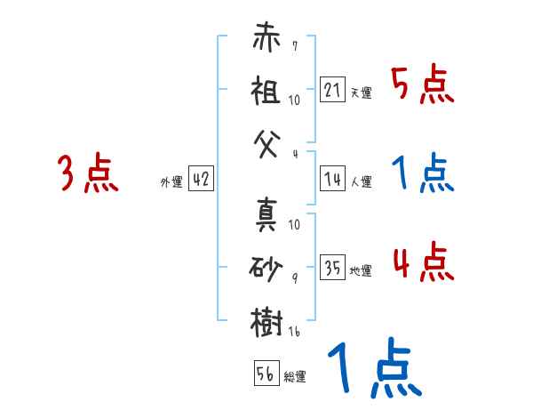 天運![]() | 赤祖父真砂樹さんの天運は21画の5つ星!統率力がある。独立し成功する。名誉を手に入れる。 家系が持つ宿命的な運勢を表します。祖先から受け継いだ苗字ですので自分の力が及びません。家柄を象徴します。 |